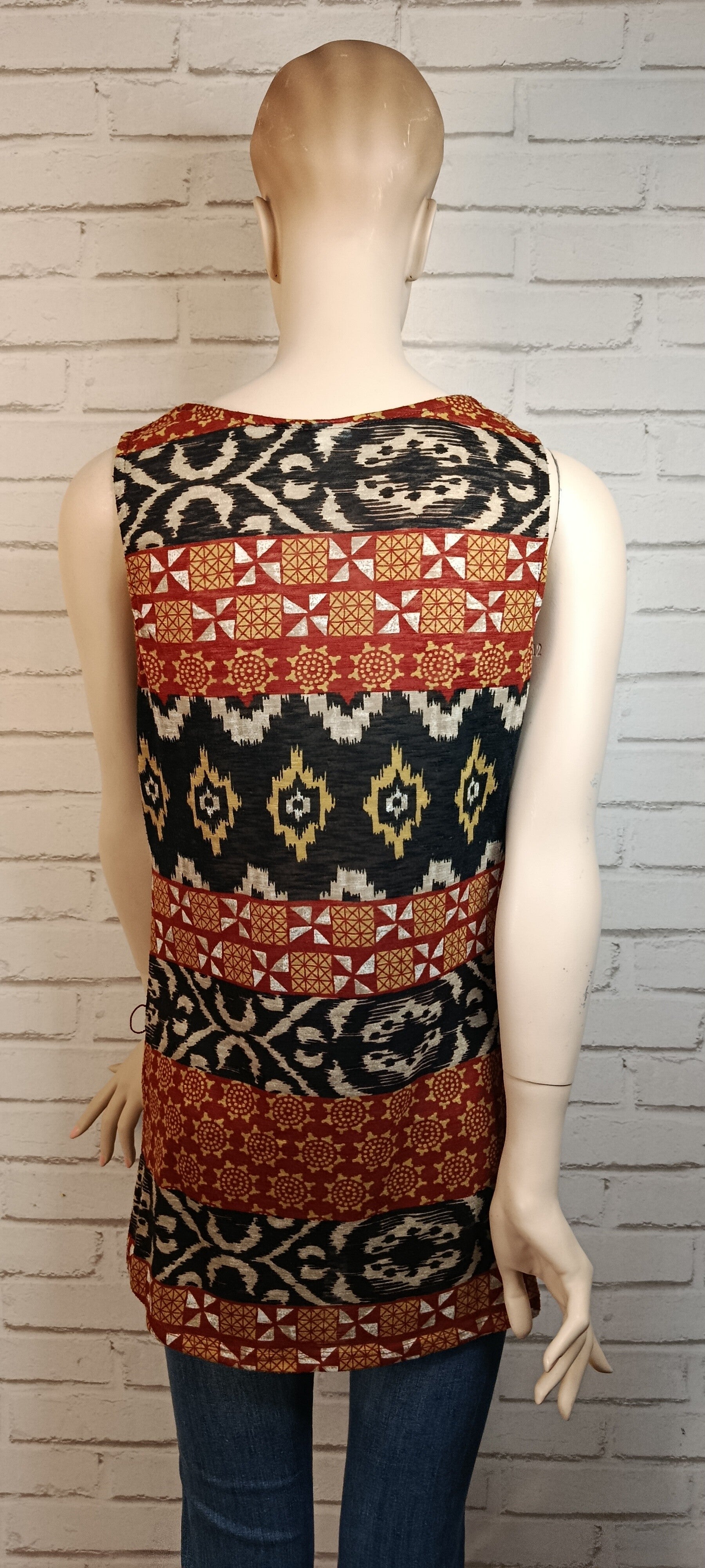 T-shirt léger sans manches en taille 36, aux motifs graphiques et ethniques dans des tons noir, beige et bordeaux. Sa coupe droite et fluide assure un porté confortable et agréable. Original et facile à associer, il apporte une touche de caractère à une tenue décontractée.