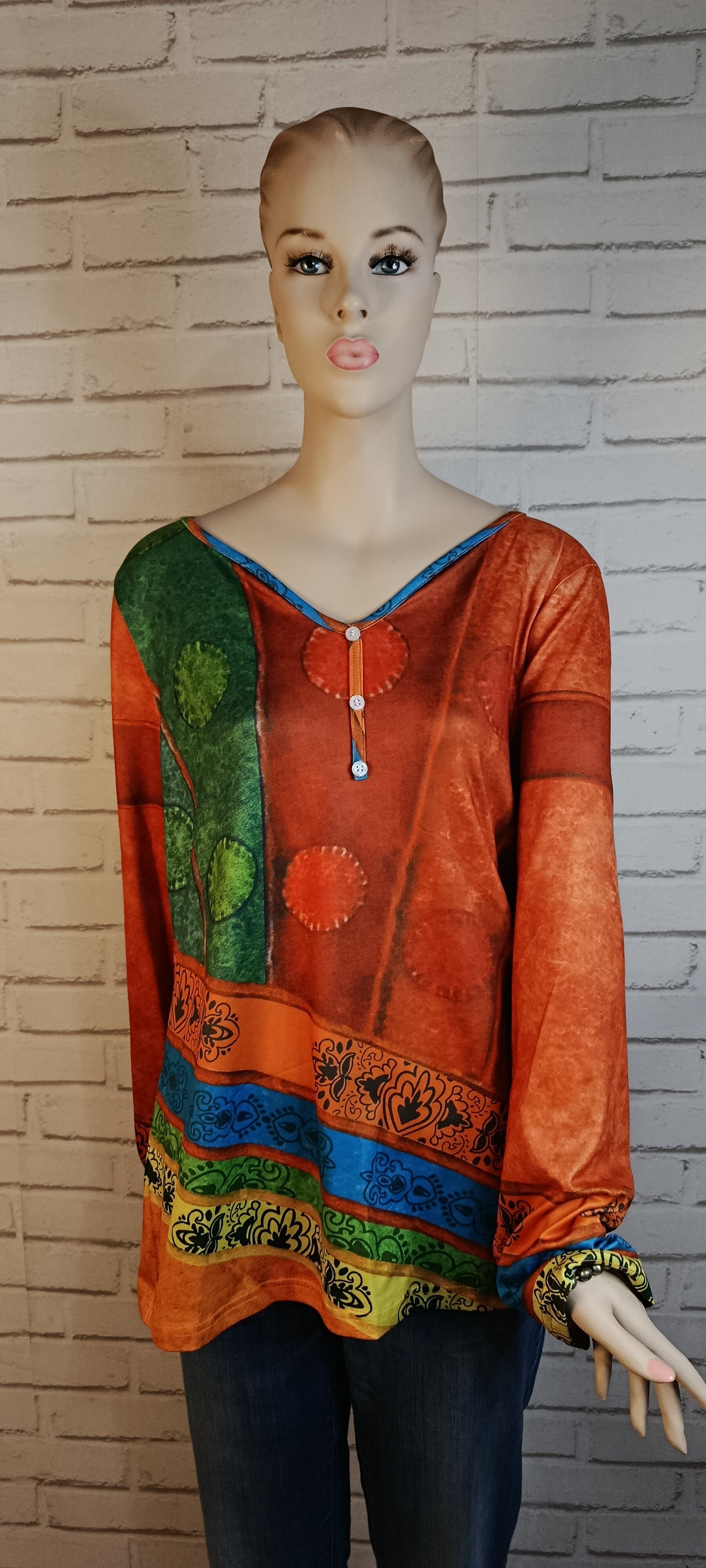 T-shirt à manches longues aux motifs colorés et originaux, mêlant des tons chauds et des détails graphiques pour un style bohème et unique. Son encolure en V avec petits boutons apporte une touche élégante, tandis que sa coupe fluide assure un grand confort.