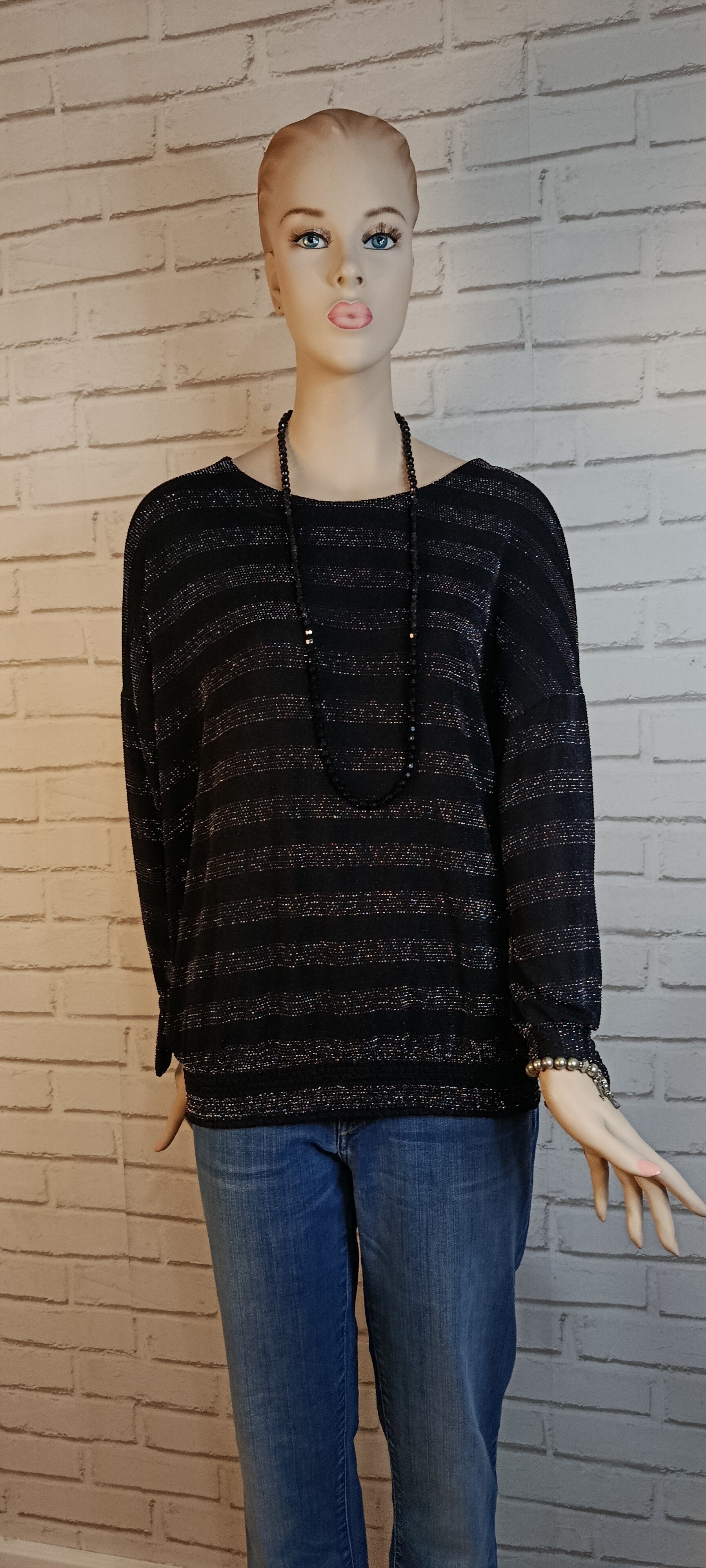 T-shirt noir à manches longues, subtilement rehaussé de fines rayures brillantes pour une touche chic et moderne. Sa coupe fluide et son encolure ronde offrent un tombé confortable et flatteur. Facile à porter, il s’adapte aussi bien à une tenue décontractée qu’à un look plus habillé.