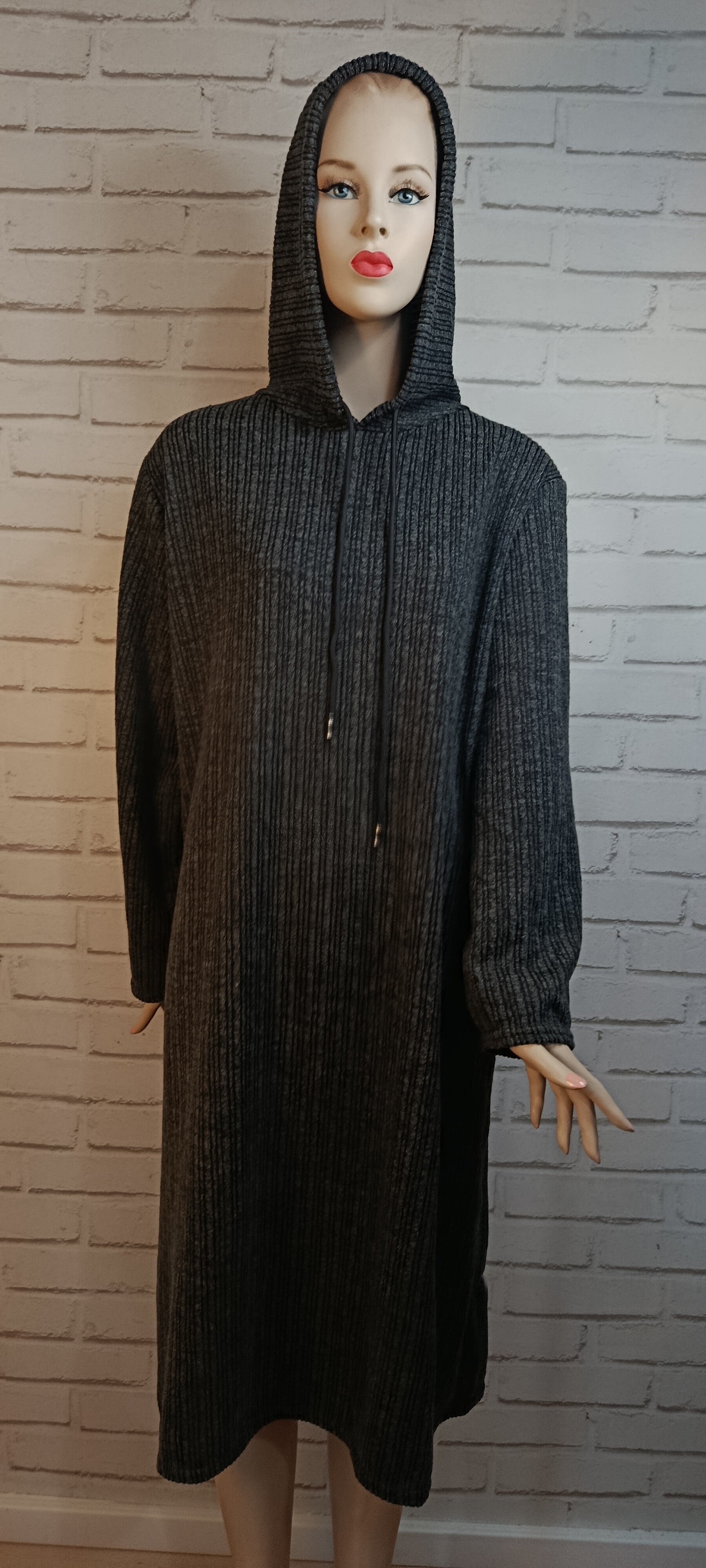 Robe longue de couleur gris foncé, au style décontracté et confortable. Confectionnée dans une maille côtelée douce, elle est dotée d’une capuche avec cordons de serrage pour une touche moderne et casual. Sa coupe droite et fluide en fait une pièce agréable à porter au quotidien, idéale pour un look simple et tendance.