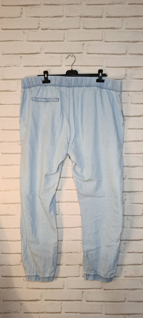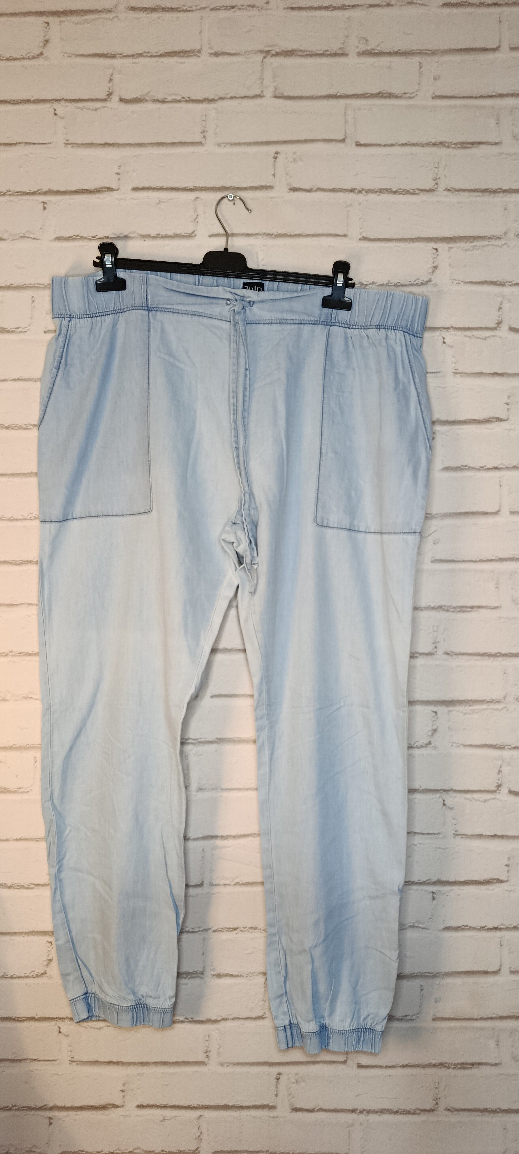 Pantalon en tissu léger bleu clair, à l’allure décontractée et moderne. Sa taille élastiquée avec lien de serrage assure un confort optimal, tandis que les poches plaquées à l’avant ajoutent une touche pratique et tendance. Les bas resserrés apportent un style casual, idéal pour un look quotidien facile à porter.