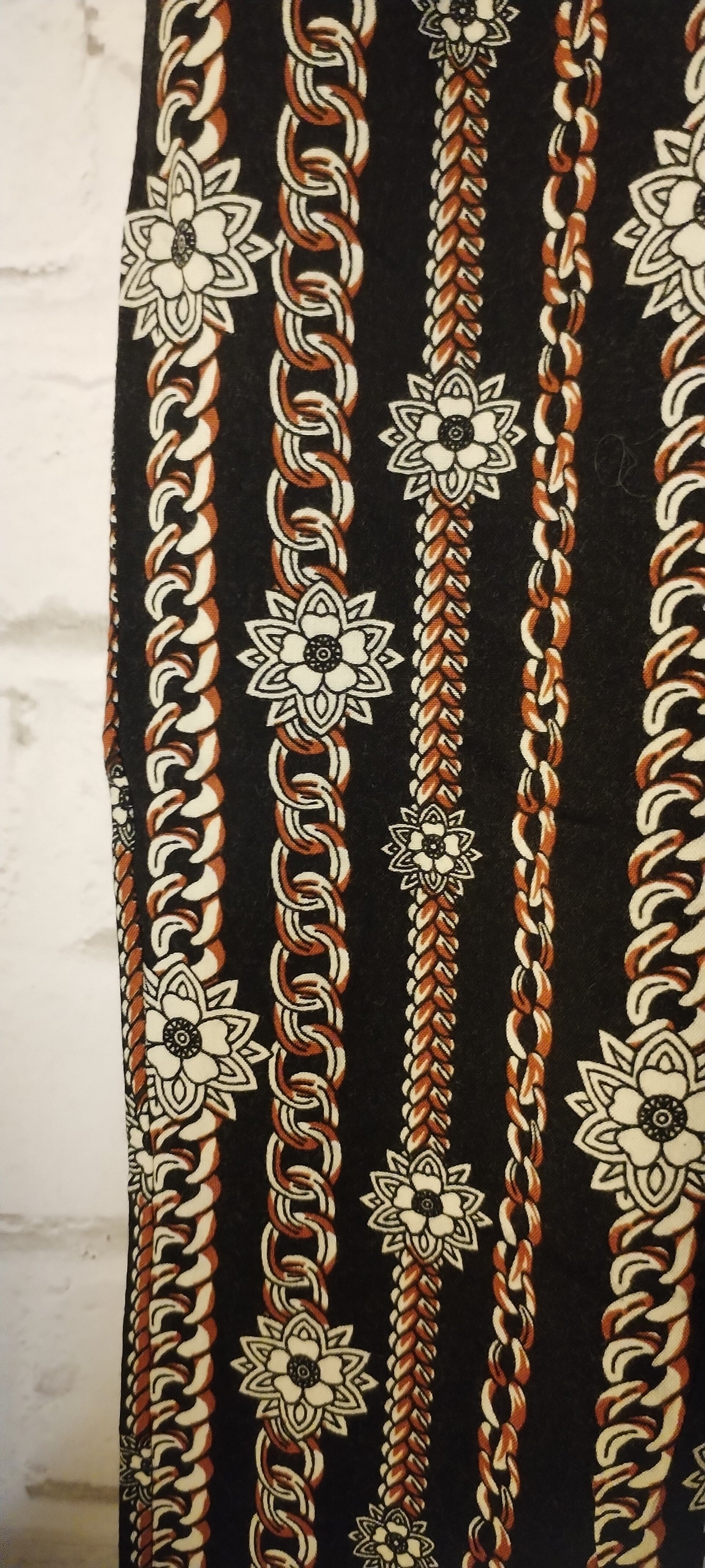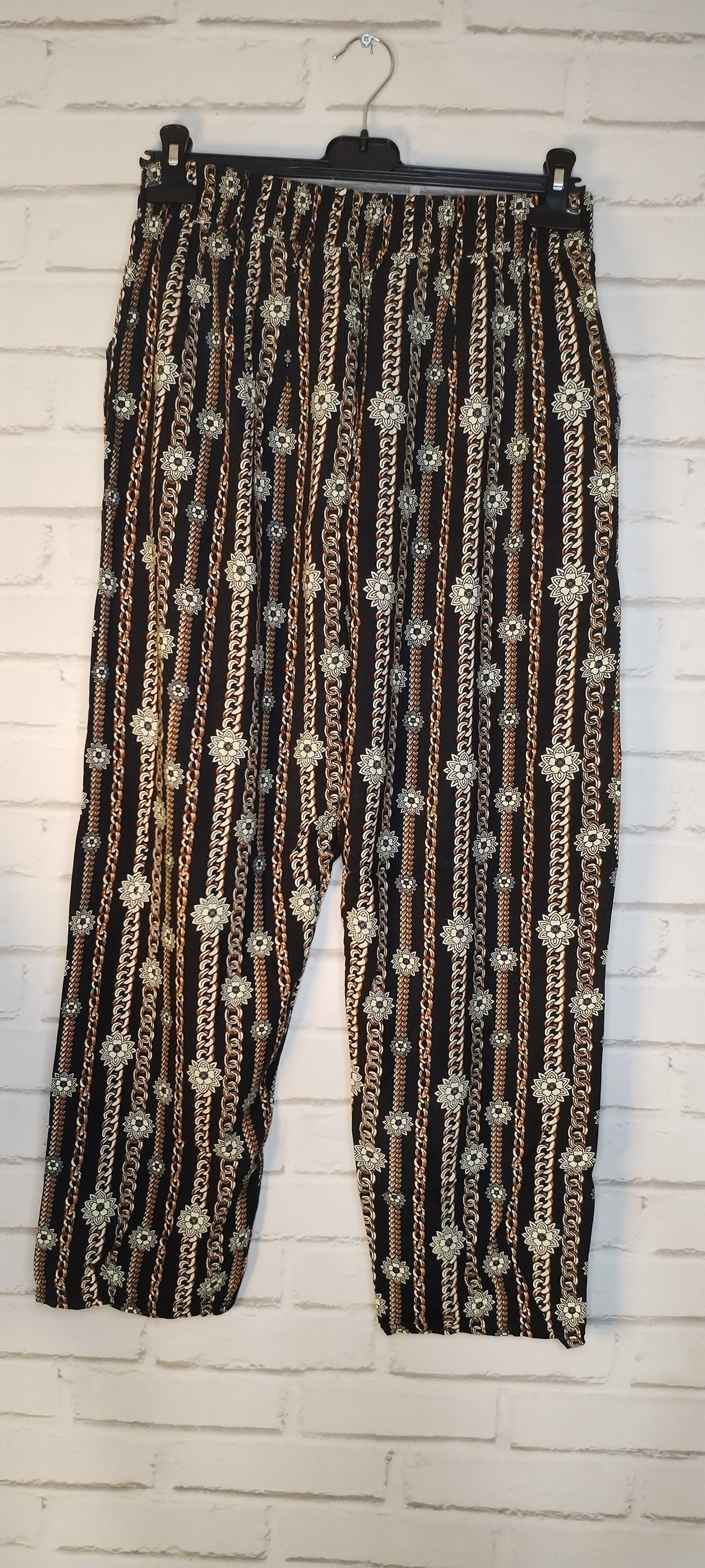 Pantalon fluide au tombé léger, sublimé par un motif élégant mêlant chaînes et fleurs. Agréable à porter, il apporte une touche raffinée et originale à la tenue, idéal pour un style à la fois chic et décontracté.