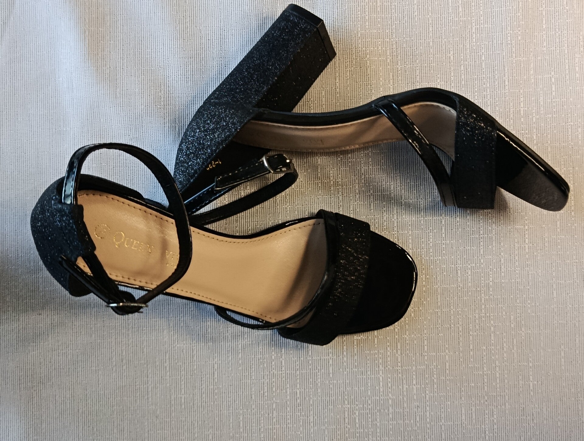 Sandales élégantes en taille 37, idéales pour sublimer une tenue habillée. Elles sont dotées d’un talon d’environ 8,5 cm qui allonge la silhouette tout en restant confortable grâce à sa forme stable. Leur finition noire légèrement scintillante apporte une touche chic et raffinée, parfaite pour une soirée, une cérémonie ou une occasion spéciale. La bride à la cheville assure un bon maintien du pied, tandis que la semelle intérieure offre un confort agréable lors du port.