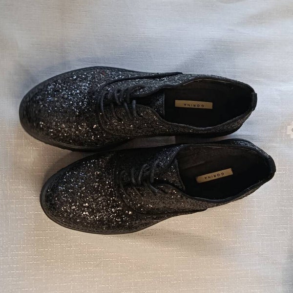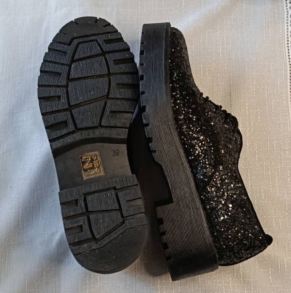 Chaussures à lacets en taille 39, au style moderne et original. Elles présentent une semelle épaisse avec un talon d’environ 5 cm, offrant à la fois de la hauteur et une bonne stabilité pour un usage quotidien. Leur finition noire pailletée apporte une touche tendance et lumineuse, idéale pour dynamiser une tenue sobre. La semelle crantée assure une bonne adhérence, tandis que le laçage permet un ajustement confortable du pied.