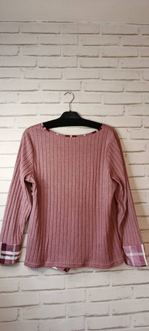 Pull léger couleur rose, indiqué en taille 42 mais convient plutôt à un 46 grâce à sa coupe ample et fluide. Tissu doux et lisse (sans mailles apparentes), agréable à porter et idéal pour la mi-saison. Coupe confortable qui tombe naturellement sur la silhouette, parfait pour un style simple et féminin.