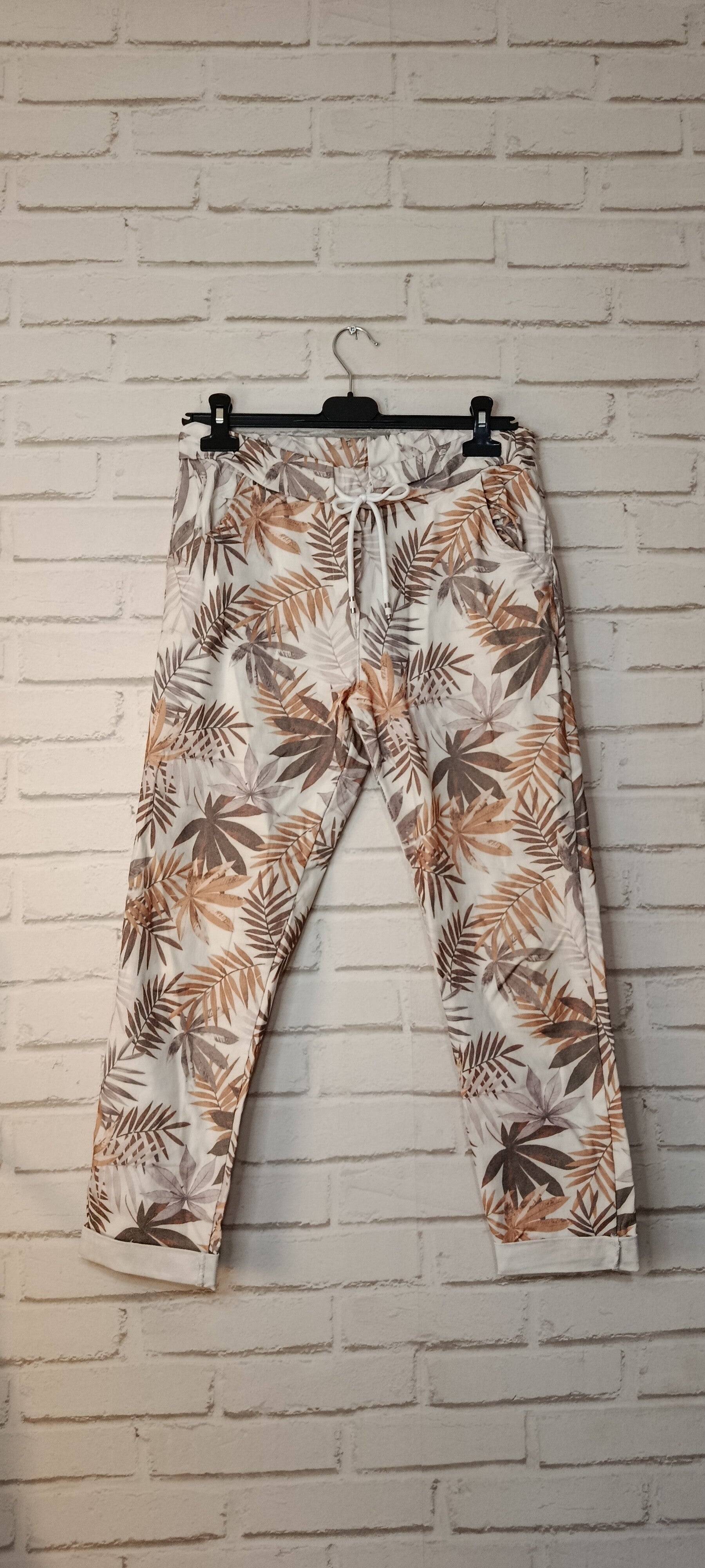 Un pantalon décontracté en stretch, taille 42, couleur crème à motifs feuilles, alliant confort et élégance naturelle. Sa coupe, souple et légèrement ajustée, offre une grande aisance de mouvement grâce à son tissu extensible. La matière stretch épouse la silhouette sans la contraindre, garantissant un porté agréable tout au long de la journée.