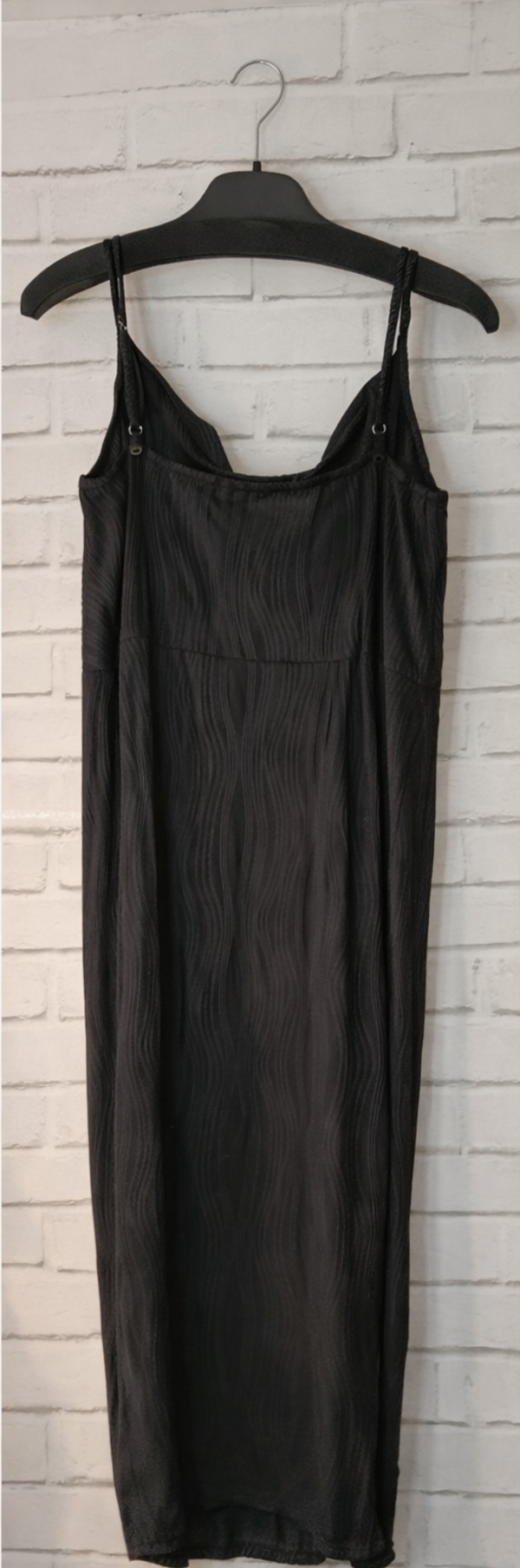 Une robe longue noire, taille 48, à fines bretelles, au style plissé élégant et féminin. Sa coupe longue élance la silhouette, tandis que le tissu plissé apporte du mouvement et une texture raffinée. Les plis réguliers créent un jeu subtil de lumière sur le noir profond, donnant à la robe une allure sophistiquée et intemporelle. Les bretelles fines dégagent délicatement les épaules et mettent en valeur le port de tête. La fente discrète sur le bas ajoute une touche sensuelle tout en facilitant la marche, laissant apparaître la jambe avec élégance à chaque pas.