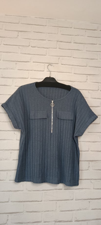 T-shirt en taille 44, à la coupe confortable et moderne. De couleur bleu grisé, il se distingue par sa matière côtelée qui apporte du relief et un joli tombé. Son col rond est agrémenté d’une fermeture zippée avec anneau métallique, ajoutant une touche tendance et féminine. Les manches courtes et les deux poches décoratives sur le devant complètent son style casual chic, idéal à porter au quotidien avec un jean ou un pantalon léger.