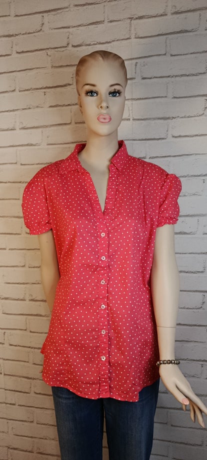 Chemisier couleur corail à pois blancs au style féminin et intemporel, parfait pour apporter une touche de fraîcheur à votre tenue. Sa coupe cintrée met joliment la silhouette en valeur, tandis que ses manches courtes légèrement bouffantes ajoutent une note élégante et délicate. Facile à porter, il se marie aussi bien avec un jean qu’un pantalon habillé pour un look chic et décontracté