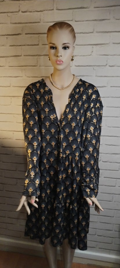 La coupe est pensée pour flatter les silhouettes généreuses, avec une ligne fluide qui tombe harmonieusement jusqu’aux genoux. Cette robe peut aussi bien convenir à une occasion habillée qu’à une tenue de journée chic, selon les accessoires choisis.